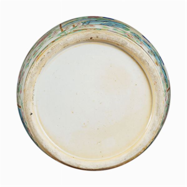 decorated in polychromy with depictions of court life scenes with vegetal, floral and butterflies patterns on the rest of the body, shaped handles, slight defects, h. 63 cm.