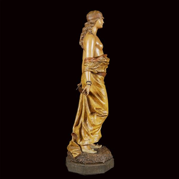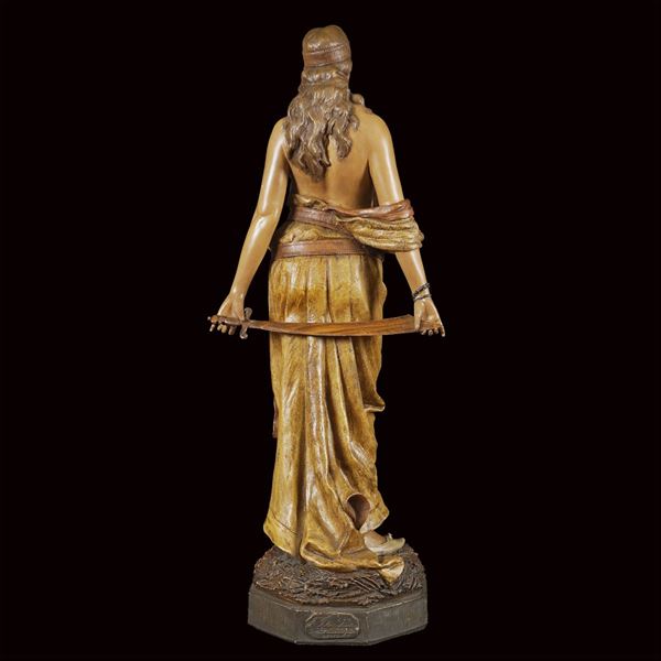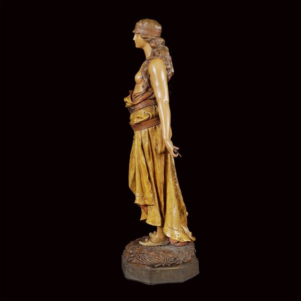 "Giuditta", terracotta sculpture decorated in polychrome, resting on black octagonal base, number and stamp "Fr Goldscheide Reproduction réservée" at the base, wooden sword, h. 60 cm.