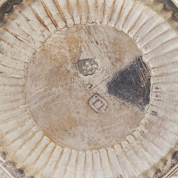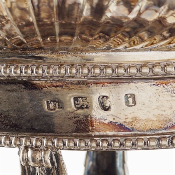 Thomas Dalton Pannett goldsmith, pierced and chiselled body with vegetal and floral patterns supported by four supports depicting Caryatids with cross-sectional ferini terminals, structure with large oval-shaped upper cup with shaped line handles, further four round cups and four ovals supported by chains complete the decoration, 48x63x51 cm., peso 3944 gr.
