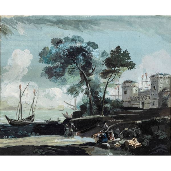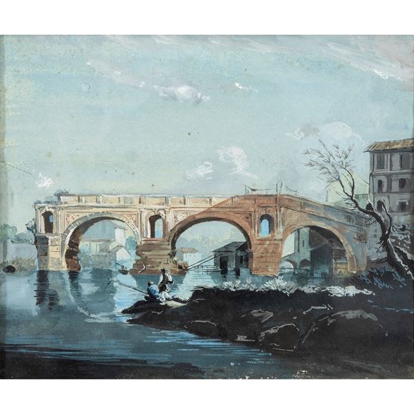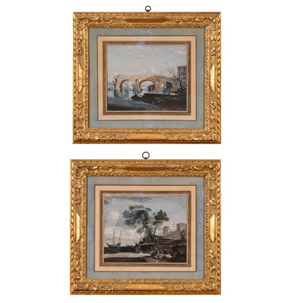 18.6x23 cm."Ponto Rotto a Roma - Marina della costa laziale", pairs of tempera paintings on cardboard, within a frame