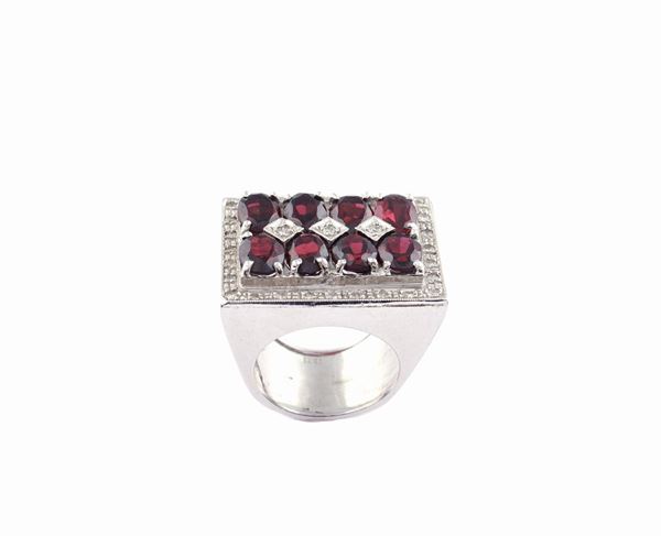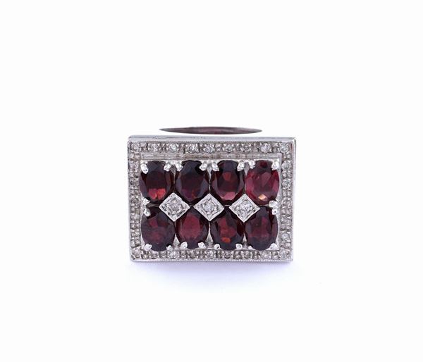 con granati taglio ovale contornati da diamanti taglio huit-huit ct. 0,40 circa, misura 12, peso 16,4 gr.