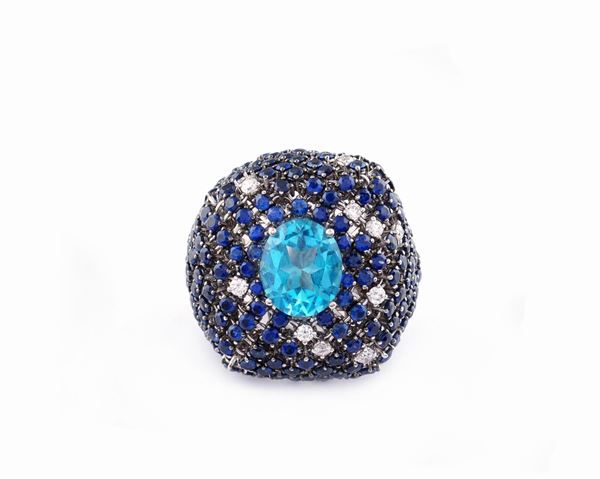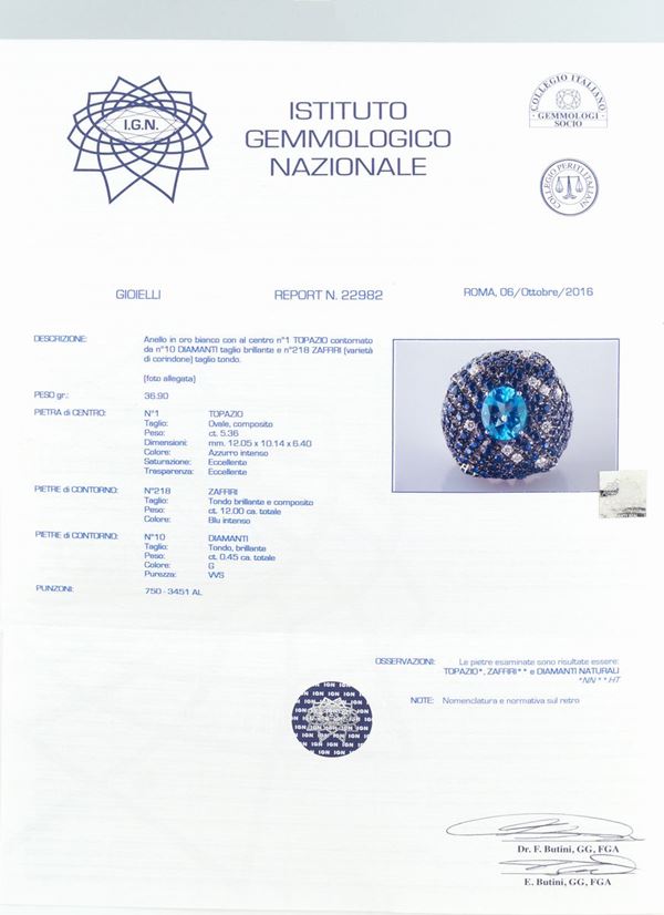 con topazio azzurro taglio ovale ct. 5,36 contornato da zaffiri taglio brillante e composito ct. 12 circa e diamanti taglio brillante ct. 0,45 circa, colore G - purezza VVS, misura 17. Completo di certificato gemmologico I.G.N n. 22982 e scatola originale, peso 37 gr.