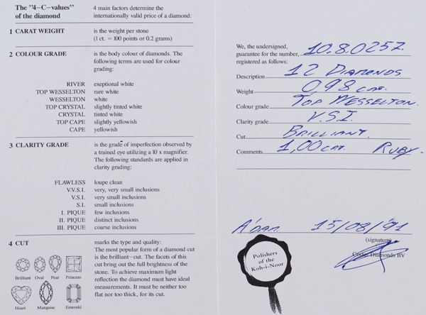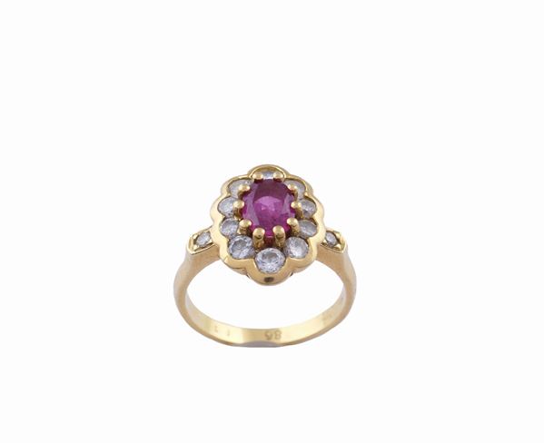 rubino taglio ovale ct 1 circa contornato da diamanti taglio brillante ct. 0,89 circa, colore Top Wesselton - purezza VSI, misura 11. Completo di certificato gemmologico Coster Diamonds BV, peso 5 gr.