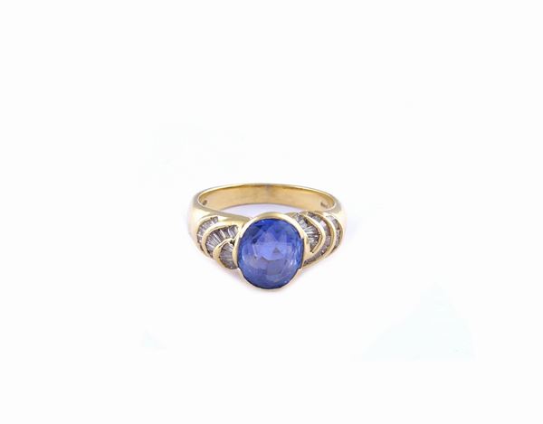 zaffiro taglio ovale briolet ct 2 circa, ai lati diamanti taglio tappered ct 0,45 circa, misura 17, peso 6,3 gr.