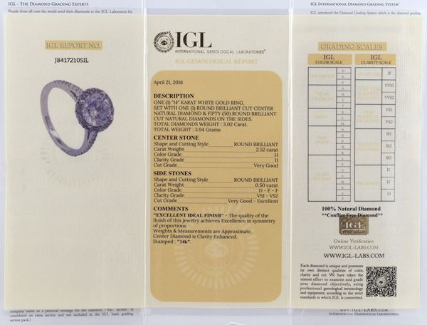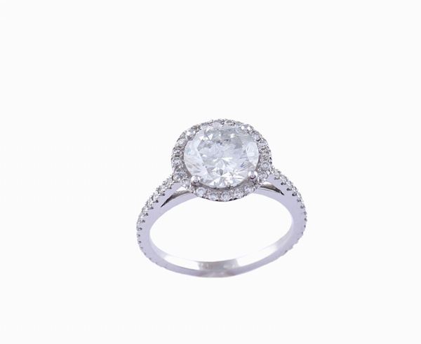 taglio brillante ct. 2,52 circa, colore H - purezza I1, contornato da diamanti taglio brillante ct. 0,50 circa colore D/F - purezza VS1/VS2, misura 16. Completo di certificato gemmologico IGL n. J841721051L , peso 4 gr.