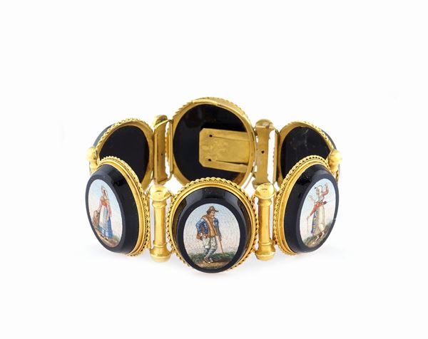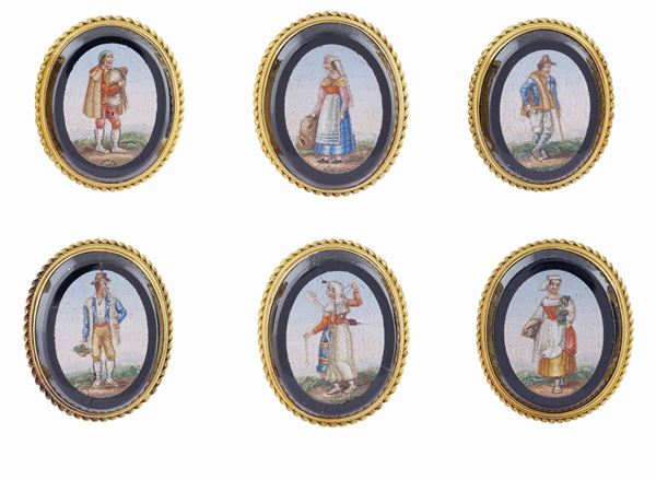 composto da sei placche ovali in micromosaico raffiguranti personaggi in costume della campagna romana, entro cornici in nero del Belgio, lunghezza cm. 18,5. Completo di astuccio originale, peso 58,40 gr.