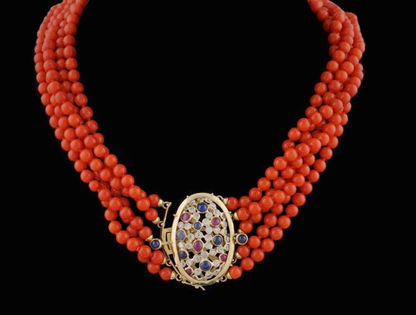 a sfere di mm. 5,5 con chiusura in oro giallo 18kt zaffiri e rubini cabochon alternati a pietre simulanti diamanti, lunghezza cm. 45, peso 97,4 gr.
