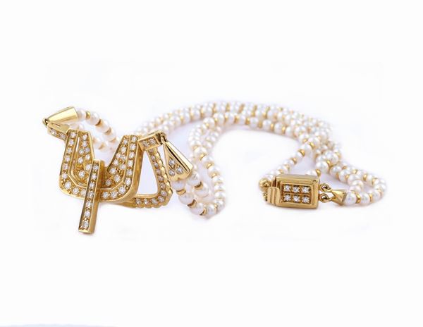 mm. 0,4 circa, alternate a rondelle in oro e centrale in oro giallo 18kt con diamanti taglio brillante ct. 1,30 circa, lunghezza cm. 40, peso 35,1 gr.