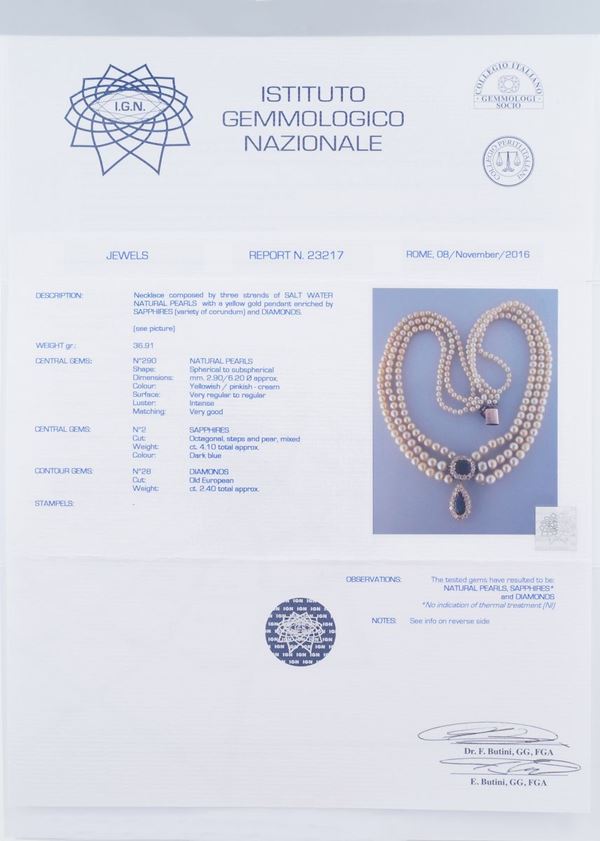 disposte a gradazione da mm. 2,90 a mm.6.20 circa riunite al centro da pendente in oro giallo con zaffiro naturale a goccia e carré ct 4,10 circa contornati da diamanti taglio brillante antico ct 2,40 circa, lunghezza 38 cm. Completo di certificato gemmologico I.G.N n.23217, peso 37 gr.