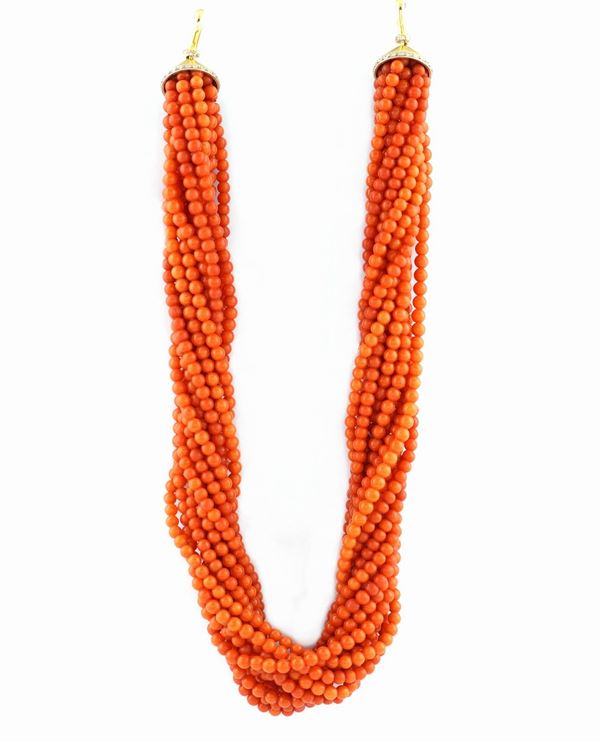 composto da 13 fili di sfere di corallo rosso mediterraneo mm..4,5 circa, chiusura ad uncino in oro giallo e diamanti taglio huit-huit ct 0,40 punti circa, lunghezza cm. 44 , peso 191,4 gr.