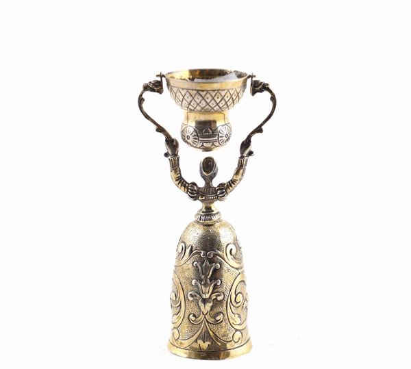 coppa decorata a motivi floreali e volute, busto femminile nell'atto di sorreggere una piccola coppa, peso 105 gr., h. 13,5 cm.