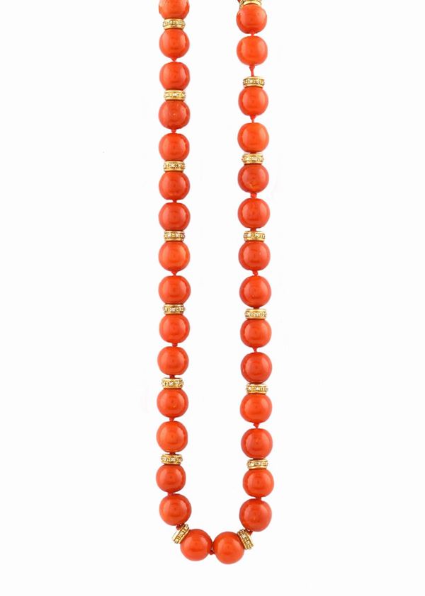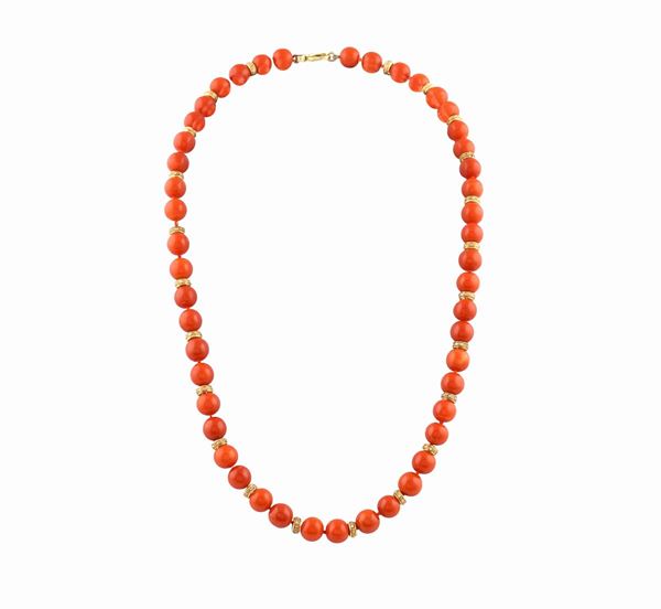di mm. 9,5 circa, alternate a rondelle in oro giallo 18kt e diamanti taglio huit-huit ct. 1,20 circa, chiusura a moschettone, lunghezza cm.44, lievi difetti, peso 86,4 gr.