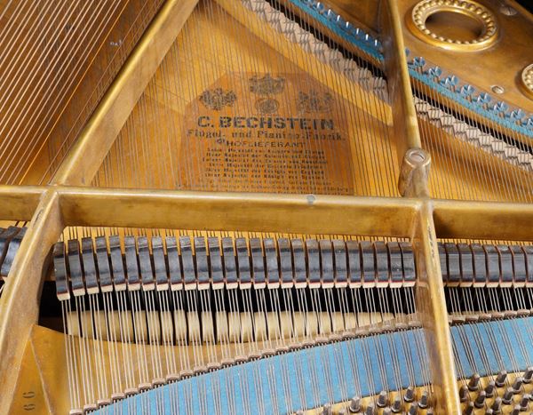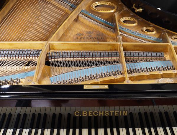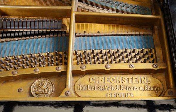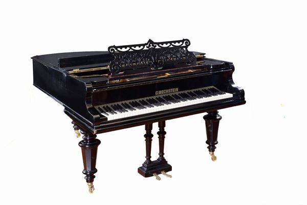 mobile nero con finitura lucida, gambe tornite provviste di rotelle, tastiera a 88 tasti originali in avorio, leggio traforato e decorato con volute, usure