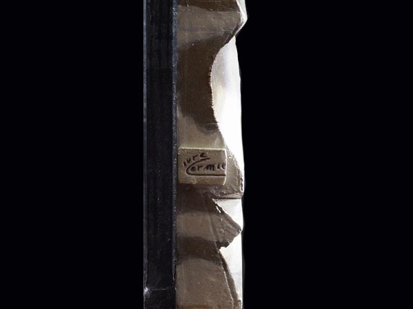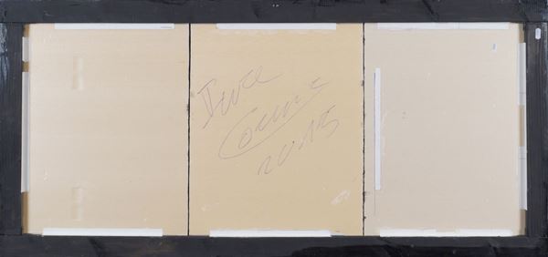 "Trittico", acrilici su stirene scolpito, anno 2015, firmato lateralmente a sinistra e sul retro, su supporto in legno ebanizzato. Autentica su foto a cura dell'artista , 59x131 cm.