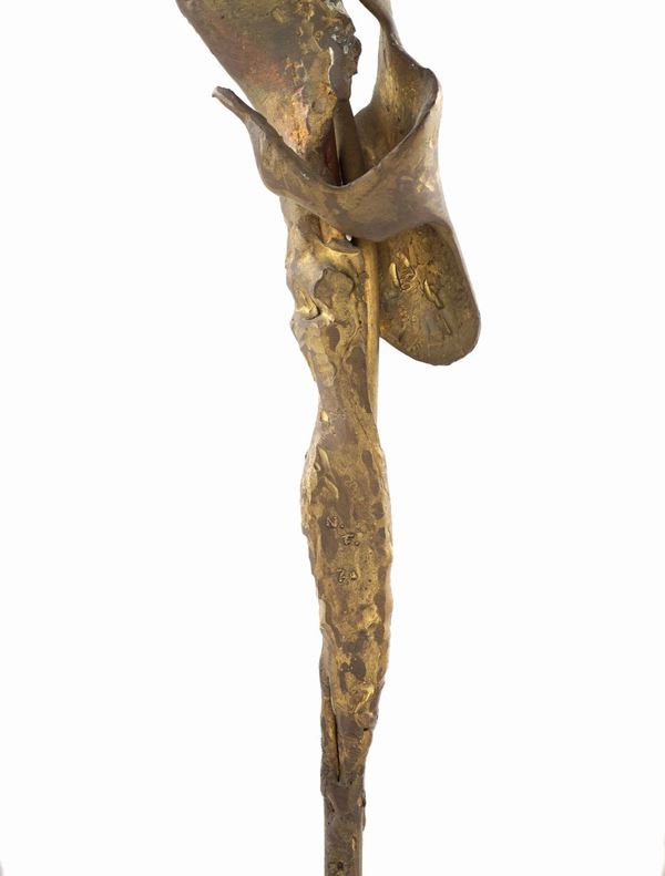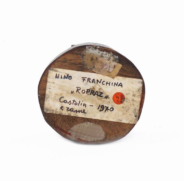 "Ropraz", anno 1970, scultura in rame patinato saldato a Castolin, siglata N.F. 70, poggiante su base circolare in legno, h. 56 cm.