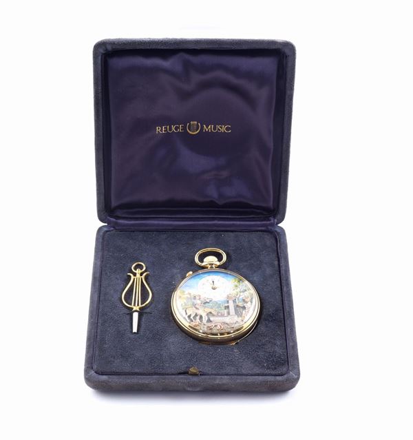 con sveglia, carillon e automa, perfettamente funzionante. Acciaio inossidabile dorato, movimento del carillon con lamelle, quadrante smaltato a colori, numeri arabi, secondi collocati al centro, lancetta per la sveglia, cassa incisa, diametro ca. 56 mm, 133 g, 1 chiave di metallo, metallo in parte dorato, entro scatola "Reuge Music". Numero di serie 6554. Nel quadrante, rappresentazione di una scena galante. , d. 56 mm.