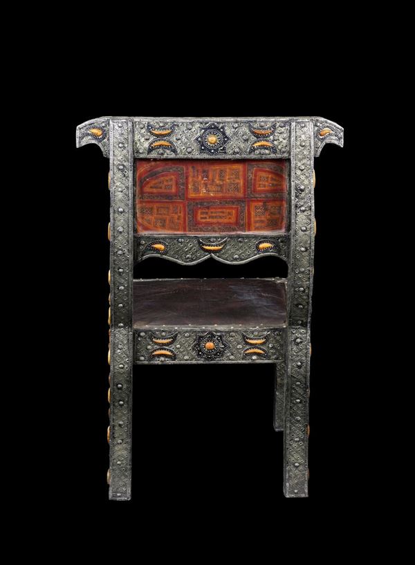 finemente cesellata con motivi geometrici e inserti in osso, seduta e schienale parzialmente rivestiti in cuoio, 100x59x52 cm.