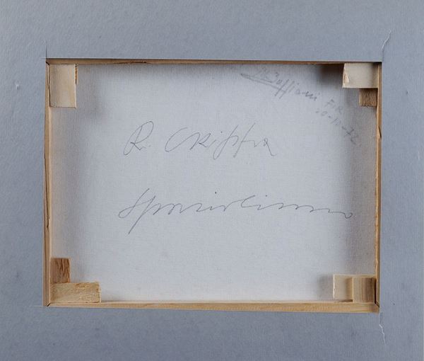 "Spazialismo", tecnica mista su tela, anni 60, firmato sul retro, entro cornice, 35x27 cm.