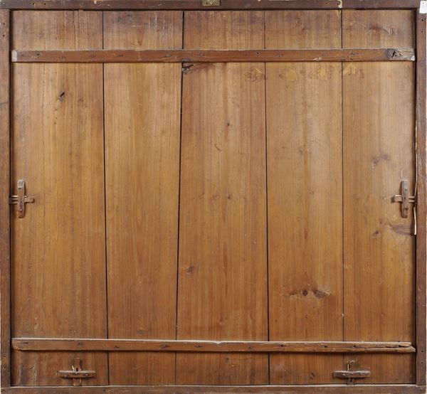 cornice traforata con motivi vegetali, specchi dipinti in policromia raffiguranti allegorie delle virtu, lievi difetti, 90x97 cm.
