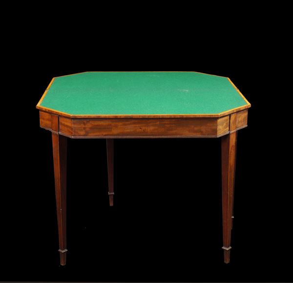 piano sagomato apribile con interno filettato in satinwood e rivestito in panno verde, poggiante su quattro sostegni ad obelisco rovesciato, aperto 75,5x91x90 cm., 73x91x44,5 cm.