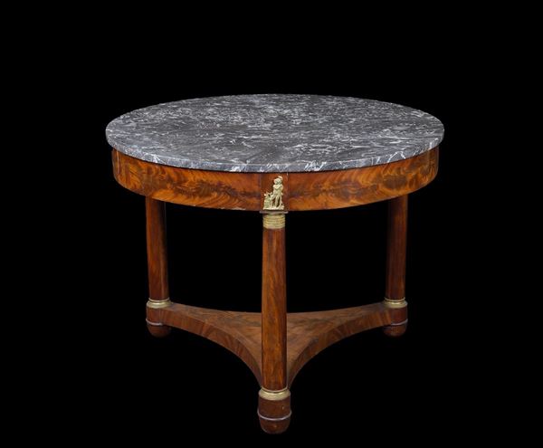 piano circolare in marmo grigio poggiante su base in mogano e piuma di mogano, gambe tornite provviste di capitelli e basi in bronzo dorato e cesellato riunite da crociera triangolare, lievi difetti, 75x94 cm.