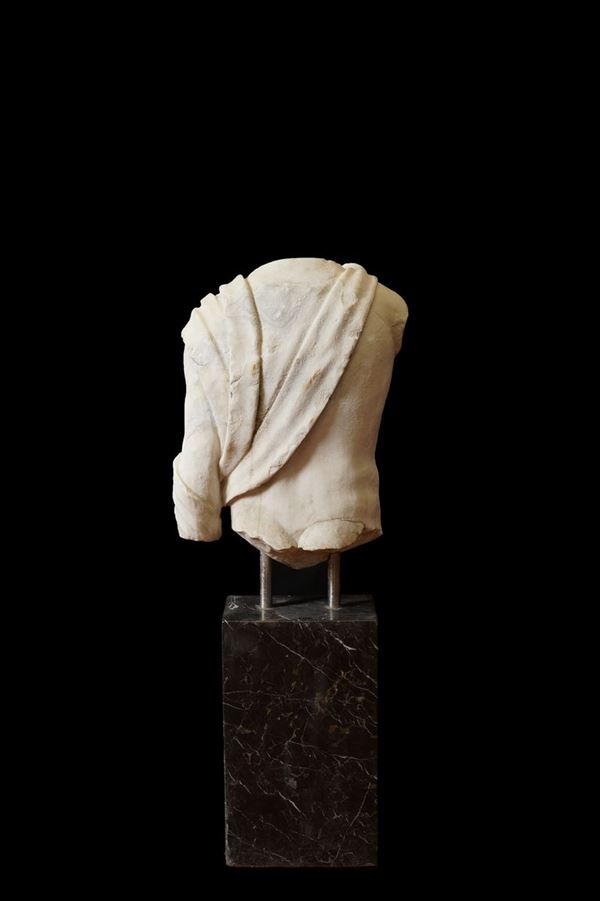 poggiante su base squadrata in marmo nero, h. 69 cm (torso), h. totale 118 cm.