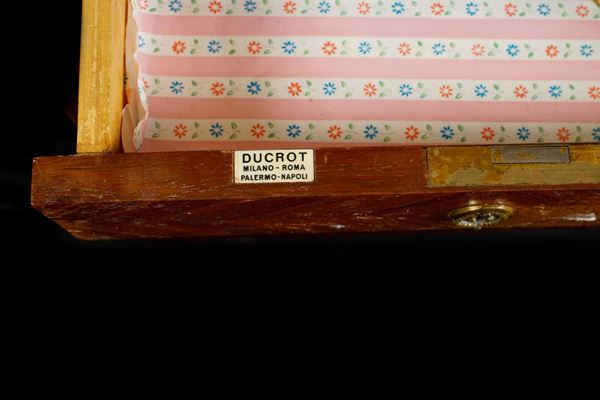 decorato con pannelli a chinoiserie raffiguranti personaggi orientali con paesaggi, fronte a due sportelli, una calatoia con due cassetti sottostanti ed ulteriori due sportelli in basso, manifattura Ducrot-Palermo, 180x80x42 cm.