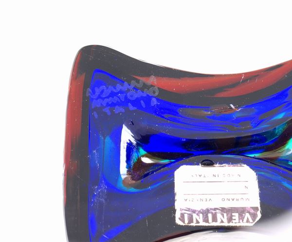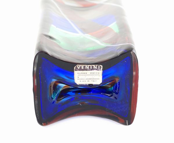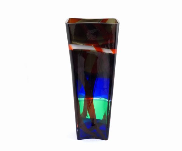 vaso "Scozzese" in vetro policromo a fasce orizzontali e verticali nelle tonalità del blu, verde, bianco e rosso, etichetta e firma all'acido Venini Murano, Italia alla base