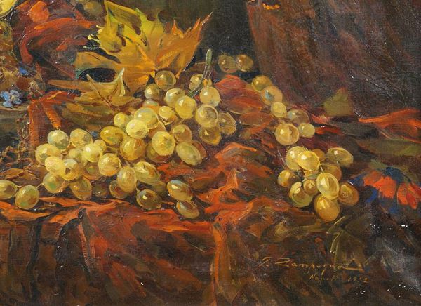 "Natura morta di frutta con cacciagioni", olio su tela, firmato in basso a destra, entro cornice in legno dorato, 69x99 cm.