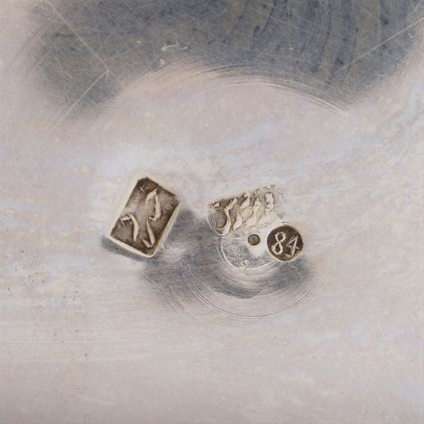 di forma circolare poggiante su tre piedini a sfera, corpo decorato con motivi floreali e bordo sagomato, 5x29 cm.S, peso 440 gr.