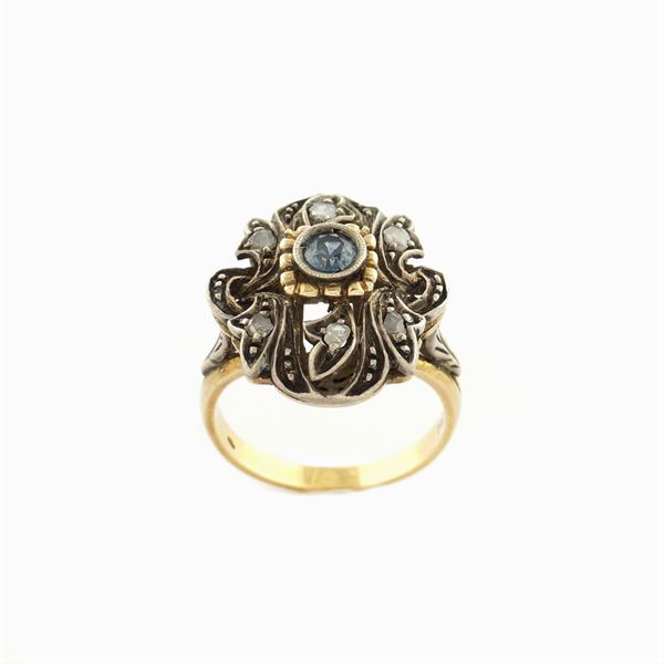con al centro zaffiro tondo circondato da rose di diamante, misura 16A, peso 8,5 gr.