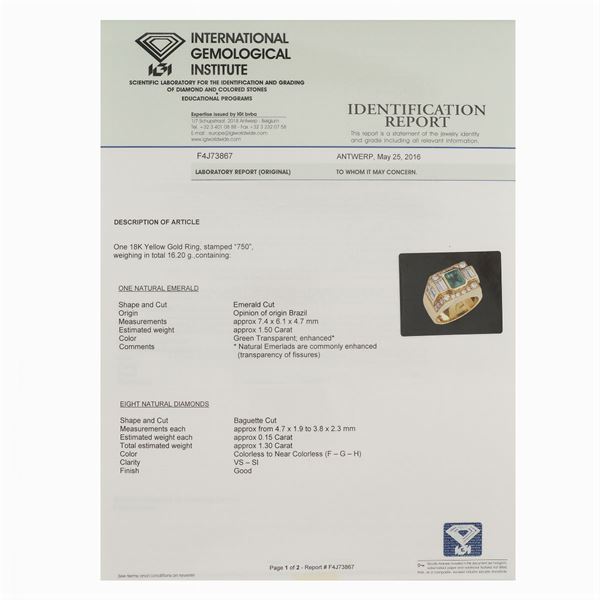 ct 1.50 circa, provenienza Brasile, ai lati diamanti taglio baguette e diamanti taglio brillante ct 1.45 circa colore F/G/H - purezza VS/SI, misura 17,5. Completo di certificato gemmologico I.G.I. n. FAJ3867 del 25/05/2016p, peso 16,2 gr.