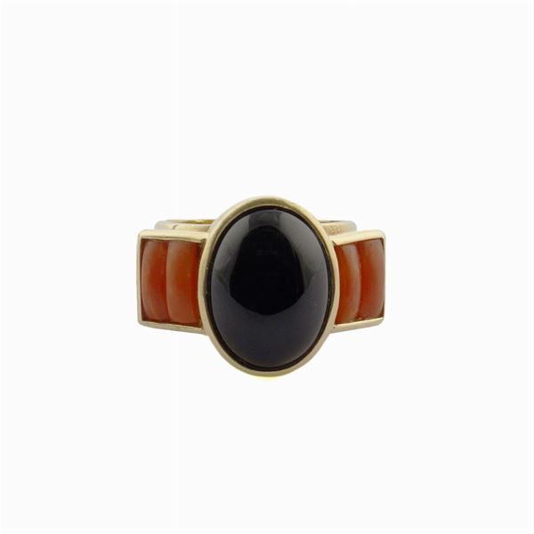 onice nero taglio cabochon e ai lati sezioni rettangolari in corallo rosso mediterraneo, misura 14,, peso 12 gr.