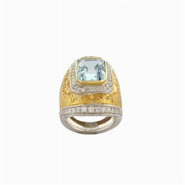 con acquamarina taglio smeraldo ct 8.70 circa e diamanti taglio brillante ct 1.20 circa, misura 14,, peso 20.2 gr.