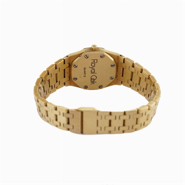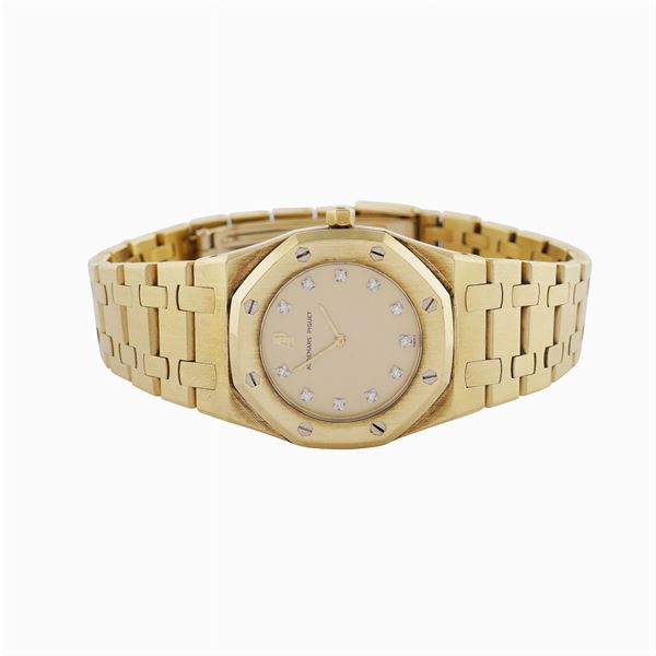 orologio da donna in oro giallo 18kt, cassa ottagonale mm. 26 ref. 2064, quadrante dorato indici con diamanti taglio brillante, movimento al quarzo n. 250527, bracciale originale Audermars Piguet in oro giallo 18kt con chiusura depolyantes, peso 110,4 gr.