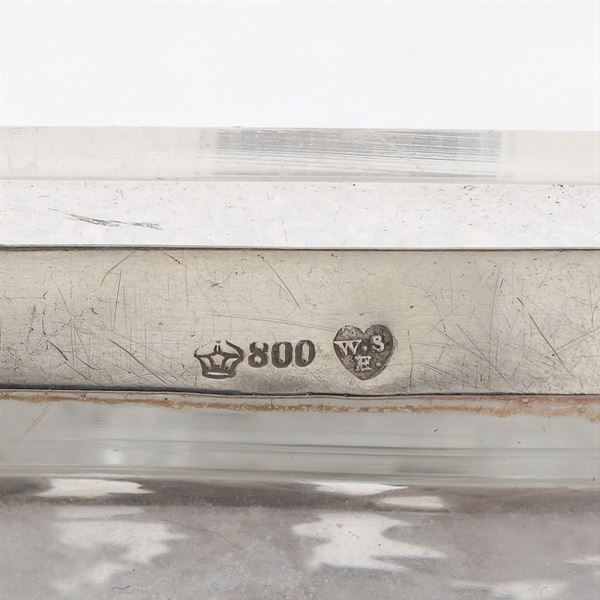 di forma squadrata in vetro inciso e decorato con volute e montatura in argento sbalzato a motivi di personaggi entro riserve, coperchio con presa a foggia di personaggio maschiler, h. 26,5 cm.