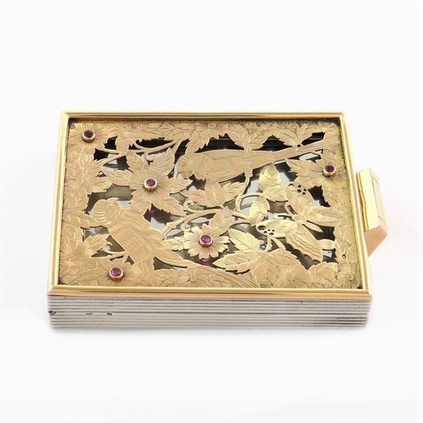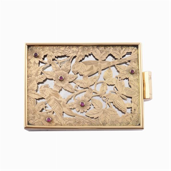 decorata con motivi floreali e animali e impreziosita da rubini tondi, con specchietto all'interno e scomparto portacipria, firmato e numerato n. 875012, peso 191,3', 1,5x7,5x5,5 cm.