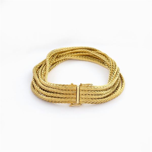 composto da 9 fili a segmenti trattenuti da chiusura in oro giallo a scomparsa, lunghezza cm. 18,5 , peso 72,6 gr.