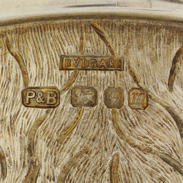 cesellato e inciso a raffigurare una testa di volpe, interno in vermeil, orafo Padgett & Braham, marchio Bulgari e punzoni territoriali impressi sul corpo, h. 16 cm
