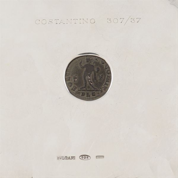 corpo liscio con profilo smerlato, centrato da una moneta romana periodo Costantino I, marchi territoriali impressi sotto la base, 2x13,5 cm.i, peso 182 gr.