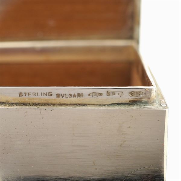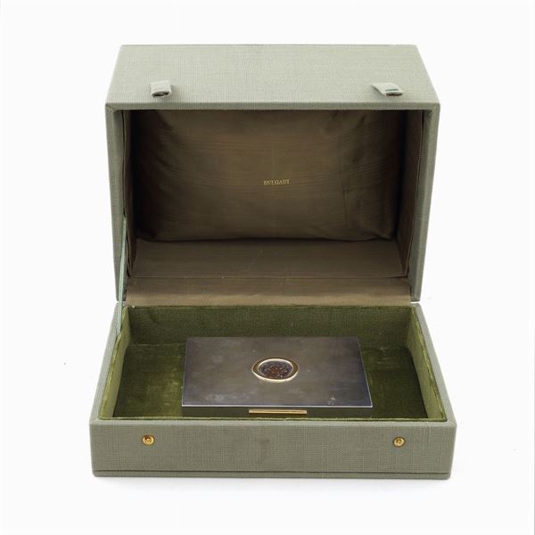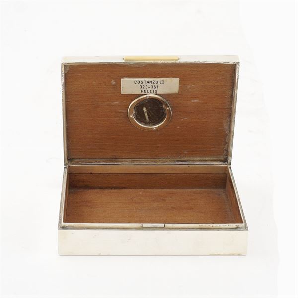 corpo liscio, coperchio centrato da una moneta romana in bronzo periodo Costanzo II, firmata Bulgari, entro scatola originale in tessuto verde, 3x13x9,5 cm.r, peso lordo 745 gr.