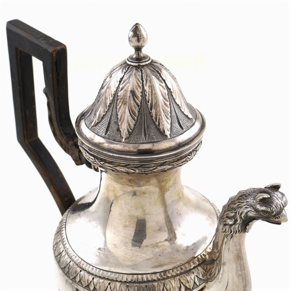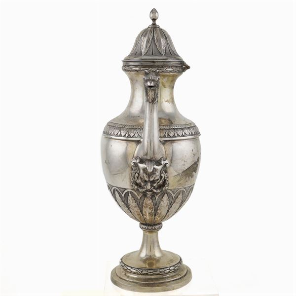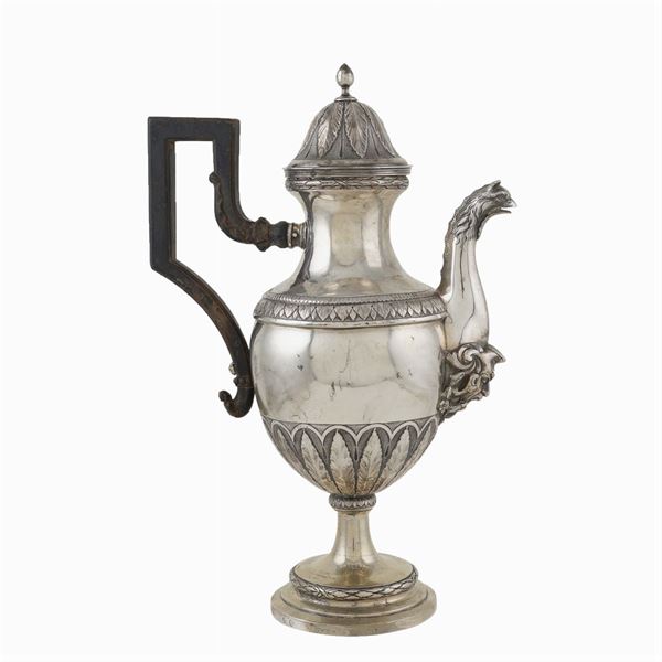 maestro argentiere Lorenzo Petroncelli (1758 -1801) (bollo n.832), corpo piriforme su base circolare decorato con motivi vegetali, beccuccio con attacco a mascherone antropomorfo e terminale a grifone, manico sagomato in legno ebanizzato, coperchio a cupola con presa a balaustro, h. 35 cm. Bibliografia: Costantino G. Bulgari, Argentieri Gemmari e Orafi D'Italia, Lorenzo Del Turco, Roma i, peso 1010 gr.