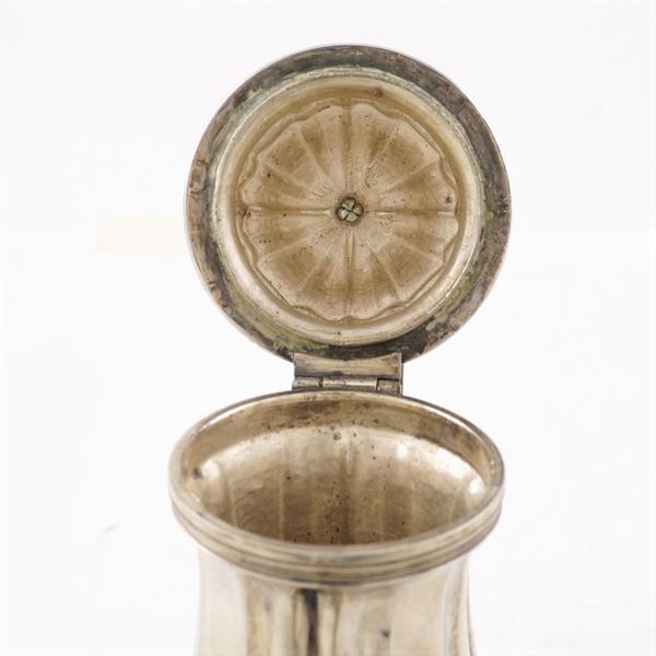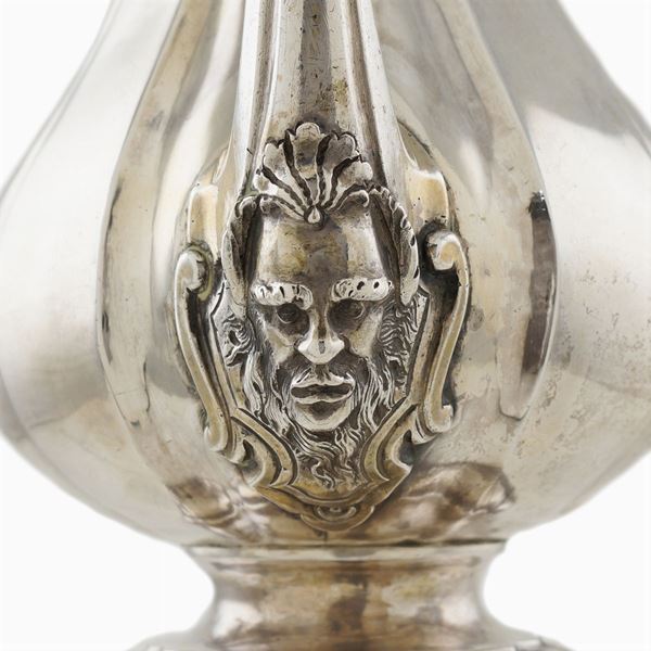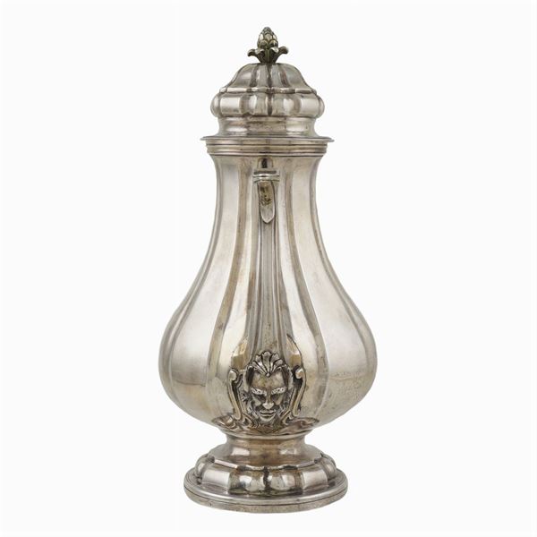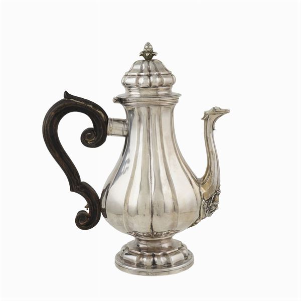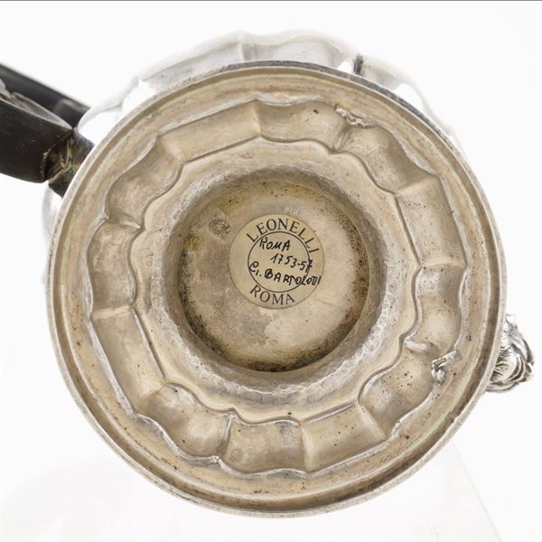 maestro argentiere Giuseppe Bartolotti (1731 - 1775 ) (bollo n. 234), corpo piriforme centinato su base circolare sagomata, becuccio con attacco a mascherone antropomorfo, manico in legno ebanizzato intagliato a volute, coperchio a cupola con presa a foggia floreale, h. 26 cm. Bibliografia: Costantino G. Bulgari, Argentieri Gemmari e Orafi D'Italia, Lorenzo Del Turco, Roma , peso 700 gr.