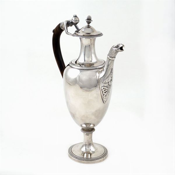 base circolare con profilo decorato a palmette, corpo piriforme a superficie liscia, manico in legno con attacco a foggia di figura femminile in argento, versatoio con becco a testa di rapace, coperchio con presa a ghianda, h. 29,5 cm. Bibliografia: Gianguido Sambonet, Gli Argenti milanesi, Maestri, botteghe e punzoni dal XIV al XIX secolo, Longanesi & C v, peso 762 gr.