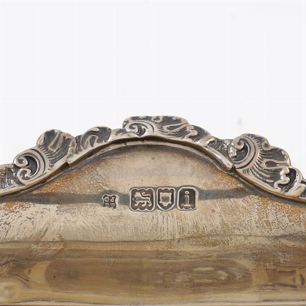 orafi George Jackson & David Fullerton, vassoio rettangolare traforato e decorato con motivi vegetali, poggiante su quattro piedini a riccio, due ampolle in cristallo molato e coperchi in argento, lievi difetti al cristallo, 9x26x11,5 cm. , peso 666 gr.