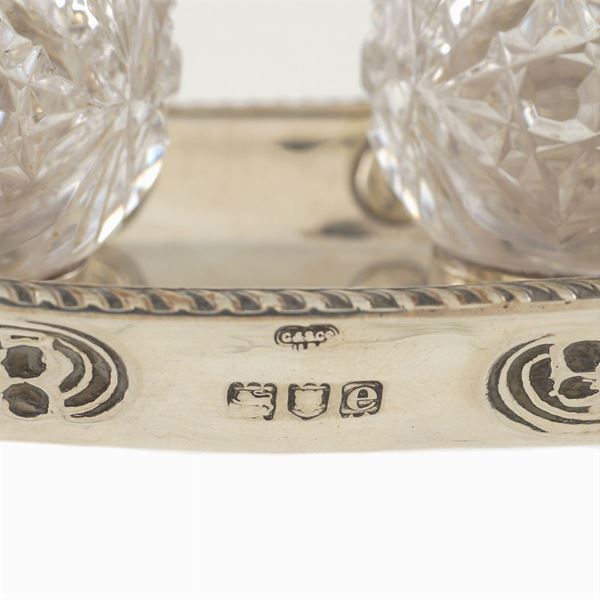 vassoio ovale sbalzato con motivi floreali e bordo godronato, poggiante su quattro piedini sagomati con due contenitori in cristallo molato con basi e coperchi in argento, 7x26,5x10 cm. , peso 200 gr.