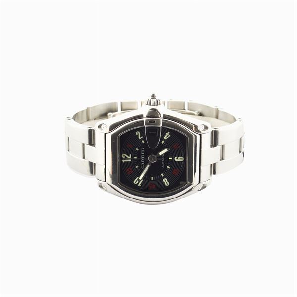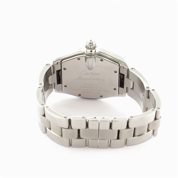 in acciaio, cassa tonneau in acciaio mm. 44x37x10, quadrante duodial nero con indici e numeri arabi, datario ore 3, vetro zaffiro, movimento a carica automatica, cinturino originale Cartier in acciaio con doppia chiusura deployante a scomparsat