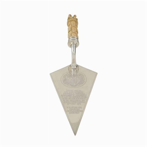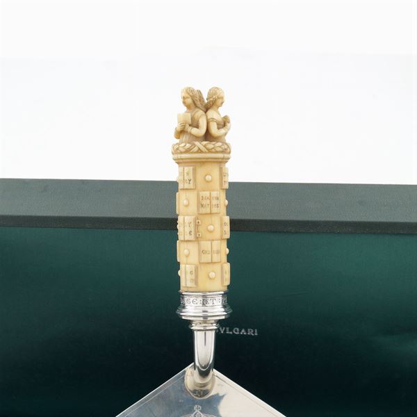 incisa da iscrizione commemorativa per l'inaugurazione del collegio femminile di Croydon nel 1879 per iniziativa dell'Arcivescovo di Canterbury Archibald Campbell ( 1811 -1882) e da stemma, manico in avorio cesellato con i simboli delle discipline scolastiche e figure femminili (difetto), entro scatola originale Bulgari, 32,5x10,5 cm. r, peso lordo 215 gr.