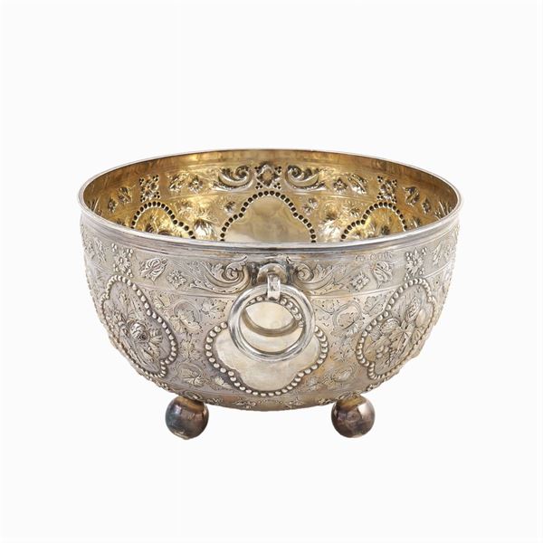 orafo Henry Wilkinson & Co, di forma circolare poggiante su quattro piedini a sfera, corpo sbalzato e decorato con motivi floreali e di frutta entro riserve, due manici ad anello di cui uno con restauro, h 16 cm. d.30 cm. a, peso 1045 gr.
