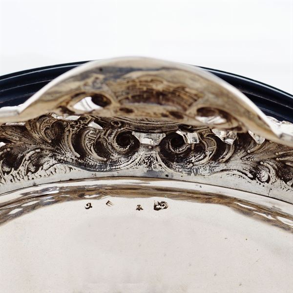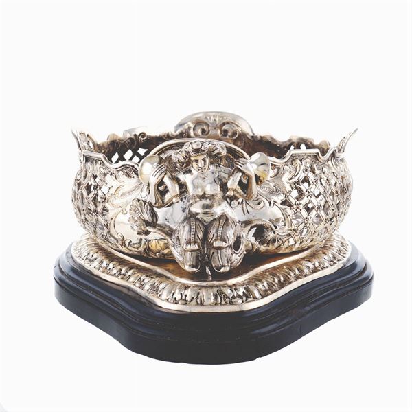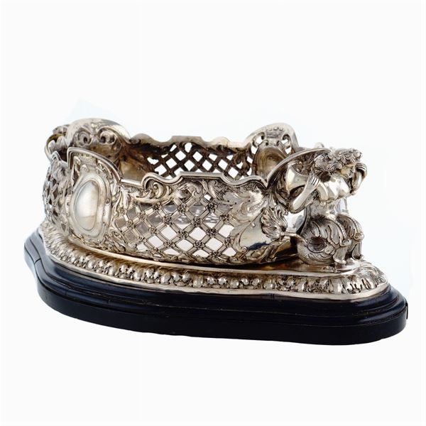 corpo traforato e cesellato con motivi vegetali, ai lati due figure femminili mitologiche nell'atto di sorreggere delle cornucopie, marchi territoriali e di garanzia impressi all'interno, poggiante su base sagomata in legno, 14x43x26 cm.i, peso 1605 gr.